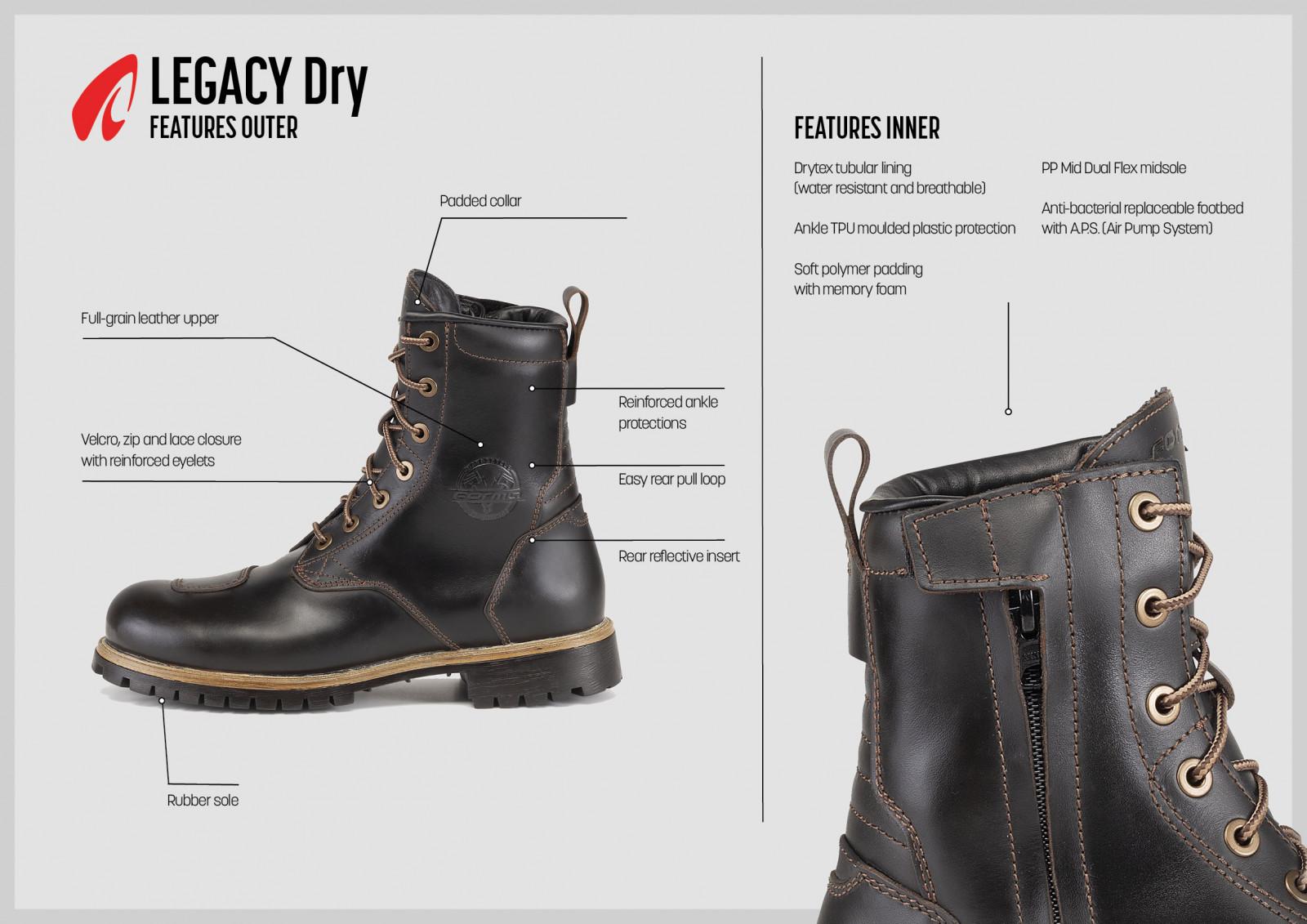 FORMA Legacy Dry støvler er designet til motorcyklister, som ønsker stilfuldt fodtøj med høj funktionalitet. Disse støvler er lavet af fuldnarvet vintage læder, som ikke kun giver et autentisk look, men også sikrer vandtæthed og åndbarhed gennem Forma Drytex membranen. Urban gummisålen fremmer både komfort og greb i bymiljøer, og den polstrede kant øger komforten yderligere. Med både lynlås og snørelukning, forstærkede øjer og en lettilgængelig bagtrækssløjfe kombinerer disse støvler bekvemmelighed med sikkerhed, herunder TPU-formet plastbeskyttelse ved anklerne