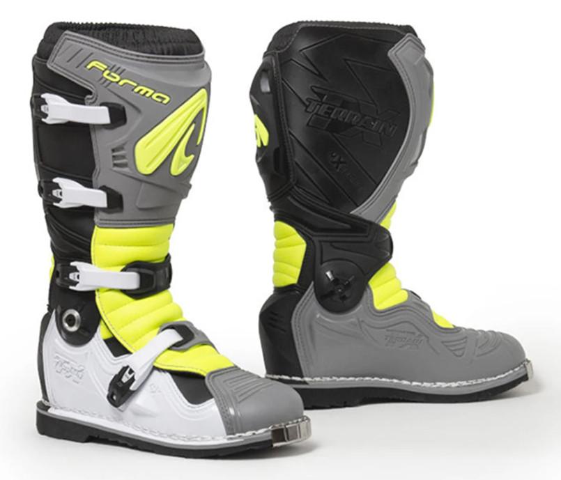 Forma Terrain Evolution TX motorcykelstøvler er designet til at levere robust beskyttelse og maksimal komfort på off-road ture. Med en overdel i syntetisk materiale, en MX-specifik gummisål, og støbte plastbeskyttelser, sikrer disse støvler dig den nødvendige støtte og sikkerhed på selv de mest krævende terræner. Støvlerne er udstyret med et Flex Control System (F.C.S.), justerbare GH-plastspænder og en stål tåkappe for ekstra holdbarhed og stabilitet. Det bløde, polstrede indre, hukommelsesskum og antibakteriel indersål med A.P.S. (Air Pump System) sikrer komfort selv under lange køreture