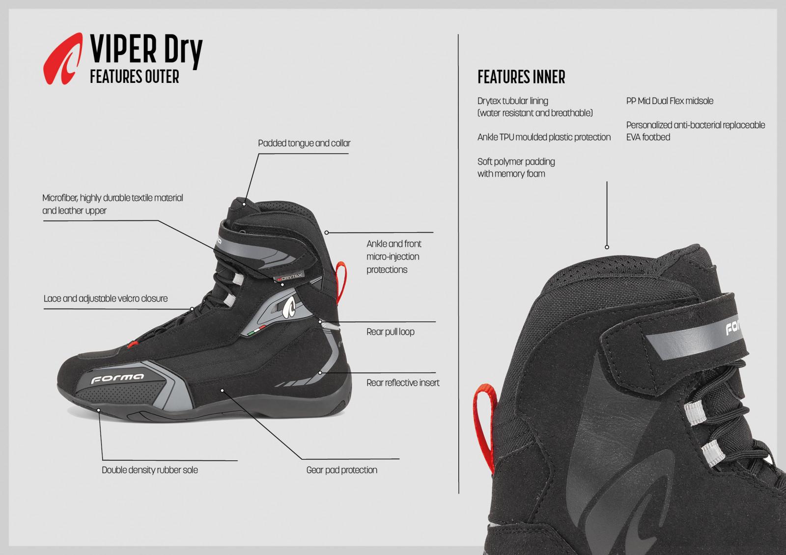 Forma Viper Dry sneakerstøvlerne er designet til at kombinere holdbarhed og komfort med et stilfuldt udseende. De ydre dele består af mikrofiber, tekstilmateriale af høj holdbarhed og læderoverdel. En tilpasset Forma gummisål med dobbelt densitet og mikro-injektionsbeskyttelse ved anklen og forrest giver øget sikkerhed, mens snørebåndene og den justerbare velcro-lukning sikrer en god pasform. En vandtæt og åndbar Forma Drytex-foring, sammen med TPU-beskyttelse ved anklen og memory foam-polstring, giver ekstra komfort under kørsel